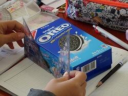 今日の学習は「直方体の辺と辺のならび方や交わり方を知ろう」です。児童は自分で直方体の箱を持ってきています。それを使って調べました。