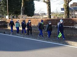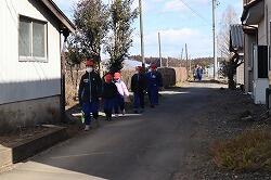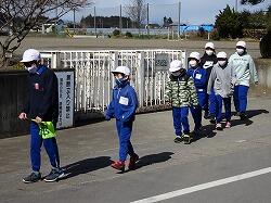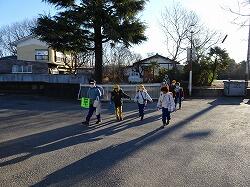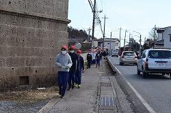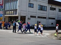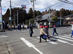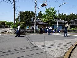 まずは、市の交通教育指導員さんから横断の仕方を教わりました。そしていよいよ登校班ごとに出発です。