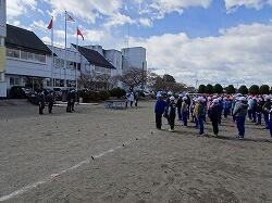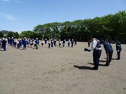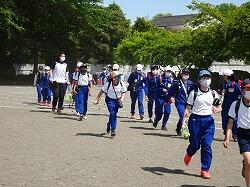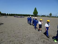 北グラウンドに避難しました。3分55秒ぐらいで避難完了です。ランドセルを背負ったり、昇降口で靴に履きかえたりしたことを考えれば、スムーズだったと思います。