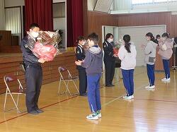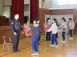 そのあと、今日来てくださったお巡りさんと2名の交通指導員さん、スクールガードの方に、代表がお花のプレゼントをしました。