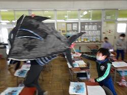 赤い小さなお魚の群れや、主人公のスイミー(黒い小さなお魚)のいるところに大きなマグロが飛び込んでくる場面です。まず、マグロの様子を教科書から調べて作業用紙にまとめていました。