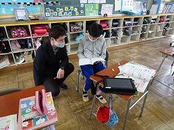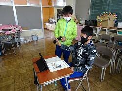外国語の学習で、自分の英語での自己紹介を動画で撮って、それを編集して、最後の外国語の授業の時に鑑賞会をしようという活動だそうです。自己紹介の内容をお互いに発表しあって確認して動画を取り合ったり、タブレットの前で振りをつけて撮っていたり、それぞれが小学校の外国語学習の仕上げに向けて頑張っていました。