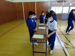 まずは、自分の席で曲を聴いてイメージを膨らますのですが、曲がかかるとうずうずと動き出してしまうような児童もいました。次に机を寄せてスペースを作りました。