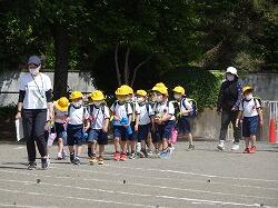 最初におまわりさんから歩く時に注意することを話していただき、交通担当の先生から横断歩道の渡り方を聞きました。
