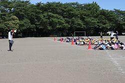 昨年度は開催されなかった郡市の陸上記録会が今年度は開催予定(今後の感染状況で変更・中止はあるそうですが、今のところ県大会や全国大会も開催予定だそうです)ということで、今週から、6年生と5年生の参加希望者が陸上練習を始めました。準備運動後、まずは走り方の強化です。