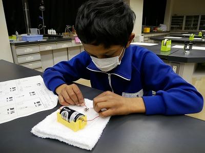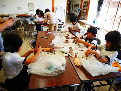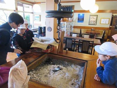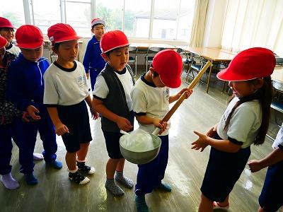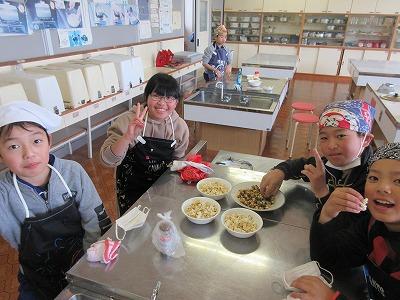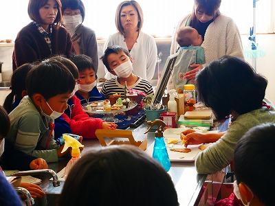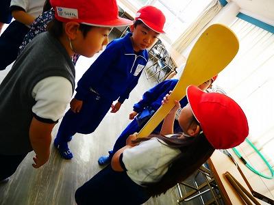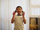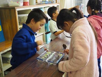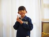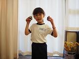 午前中、真岡市第一給食センターに行きました。給食がどのように作られているのかを見学したり、センターで使われている調理道具に触れて、その大きさや重さを体感したりしました。午後は、根本山自然観察センターに行き、野外の散策をしながら落ち葉やドングリを拾いました。センターに戻ってから、拾ったドングリでやじろべえやコマを作りました。