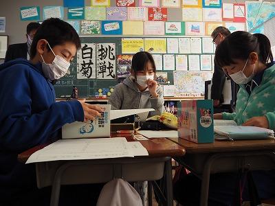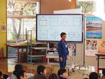 2年「三角形と四角形」の単元で、折り紙で作った長方形、正方形、直角三角形を敷き詰めた模様を作りました。6年「課題学習」で、「うさぎとかめ」の話を表したグラフから、時間や道のりを読み取ったり、速さを求めたりしました。4年「概数を使った計算」の単元で、98×42の積や6000÷42の商を、100×40や6000÷40と、概数にしてから計算する学習をしました。