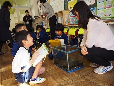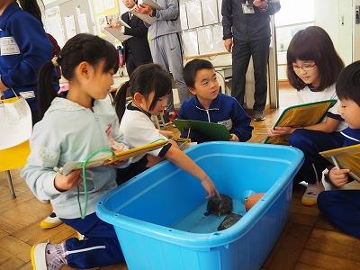 1年国語「わたしのはっけん」:カメを観察(見たり、さわったり、嗅いだり、聞いたり)し、気付いたことを「はっけんメモ」に書く学習をしました。