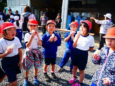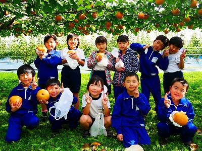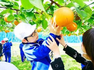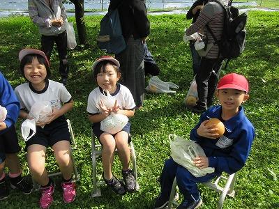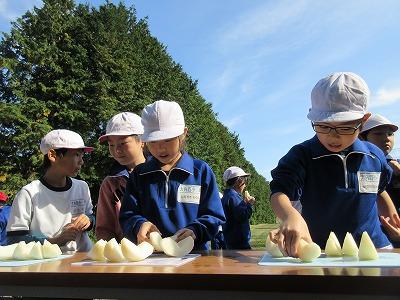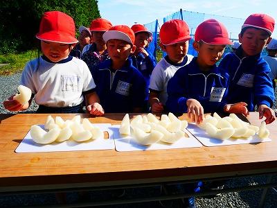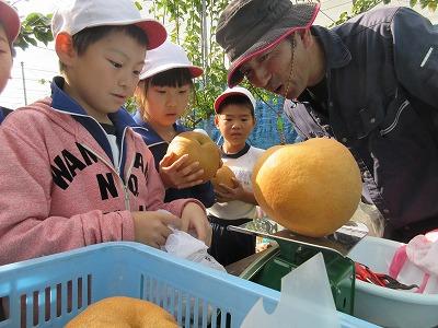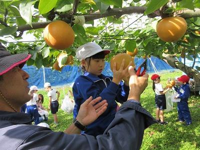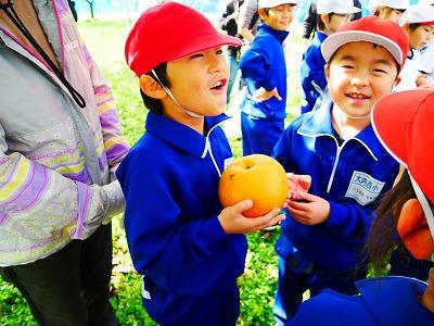 雨天のために延期していた宇大附属農場への梨狩りを、よい天気に恵まれた今日行うことができました。収穫した梨の品種は、「にっこり」で、子どもたちの顔と同じぐらい大きなものもありました。収穫したばかりの梨は、みずみずしくてとてもおいしかったようです。延期したにもかかわらず、ご協力いただいた保護者の皆様、ありがとうございました。