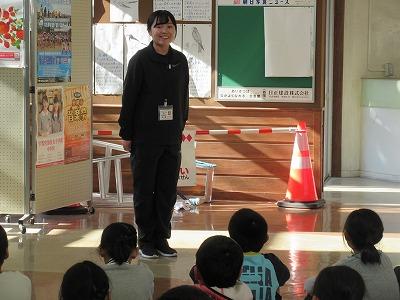 昨年の交通安全教室は、校庭に模擬道路を作り、1・2年生は「交差点の歩き方」、3・4・5・6年生は「自転車の正しい乗り方」を駐在さんや交通指導員さんに教えてもらいました。今回は、「自転車シミュレーター」を使った体験型の交通安全教室です。これは、道路で起こるさまざまな交通状況を映像で再現し、疑似体験をしながら交通ルールを実践的に学習できる装置で、本校では4年前にも行いました。なぜ定期的に行うかというと、芳賀管内では毎年20人以上の小中学生が交通事故に遭っていて、そのほとんどが自転車に乗っているときに起きているからです。そして、その中で最も多い原因は、「飛び出し」と「左右の確認をしない」ことです。正門のところに「交通安全」の看板があり、「とびだし注意」「左右かくにん」と書いてありますが、この2つのことを守ることができれば、交通事故は必ず減りますので、これからもきちんと守ってください。