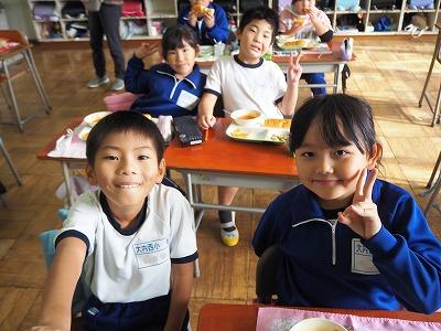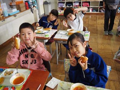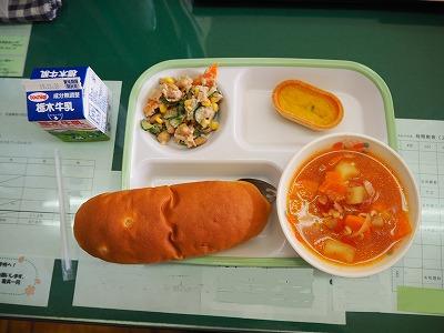 献立:米粉パン、牛乳、トマトオムレツ、チーズと野菜のサラダ、マカロニスープ