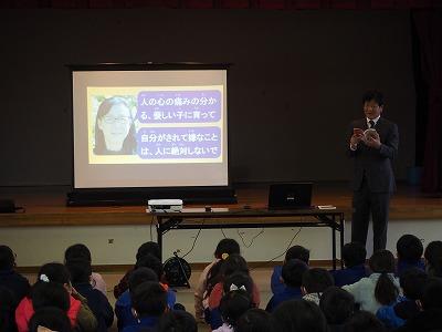 12月の人権月間に併せて、本校でも、12月2日(月)から20日(金)までを「なかよし月間」として、いろいろな行事を行っています。今日は、いじめで自殺をした娘の母親である、小森美登里さんの話をもとに講話をしました。