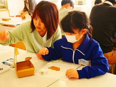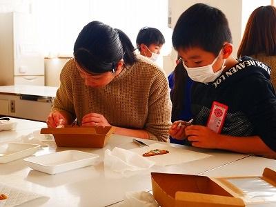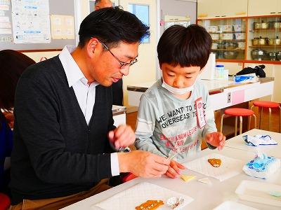 今日の研修は、デコパージュです。デコパージュとは、紙に描かれた絵や模様を切り抜いて、バッグやシューズなどに貼り、コーティングを塗り重ねてオリジナルアイテムを作る手芸のことです。講師の先生の指導のもと、親子で協力して、オリジナルのバッグやウエットティッシュケースを作りました。研修のあと、給食の試食会を行いました。