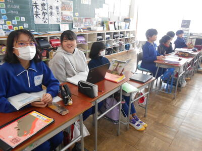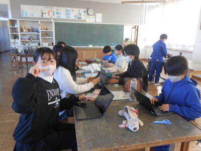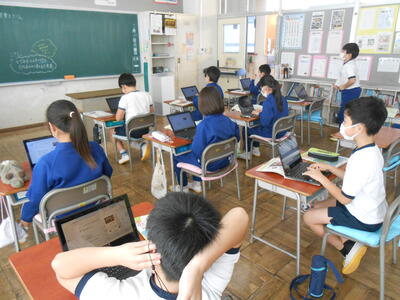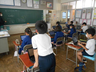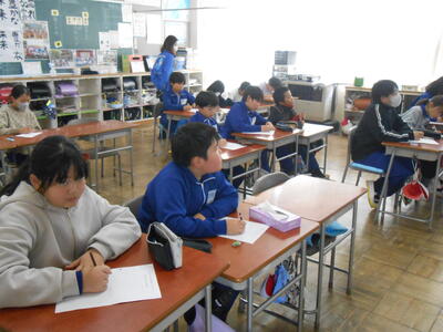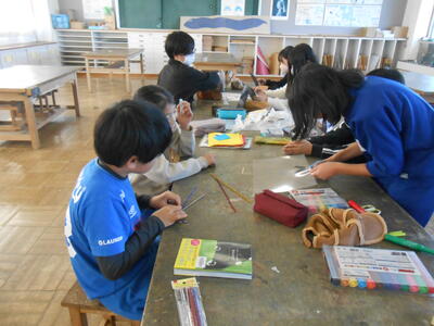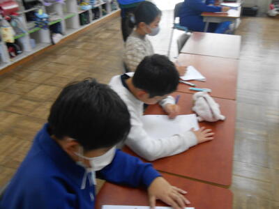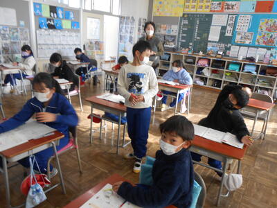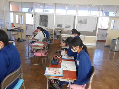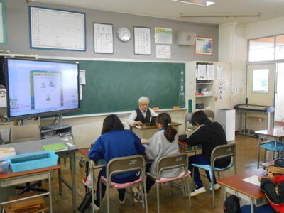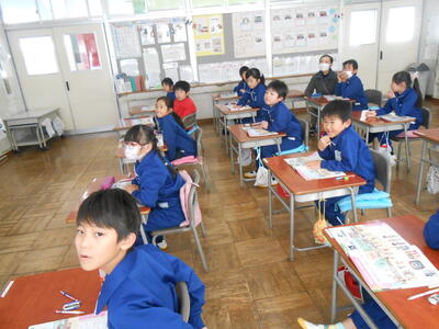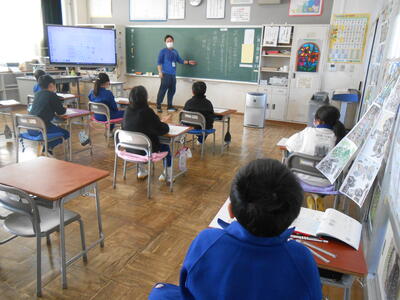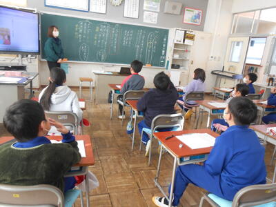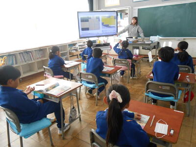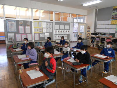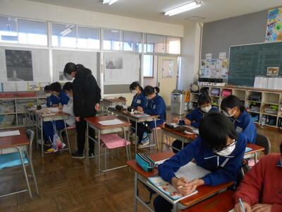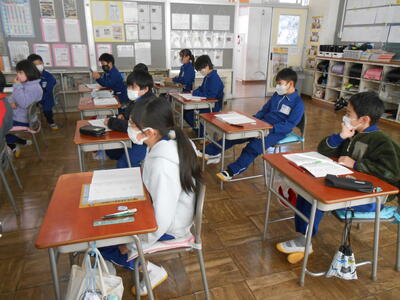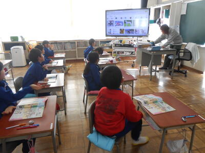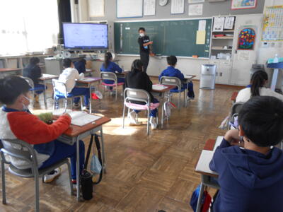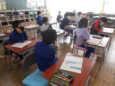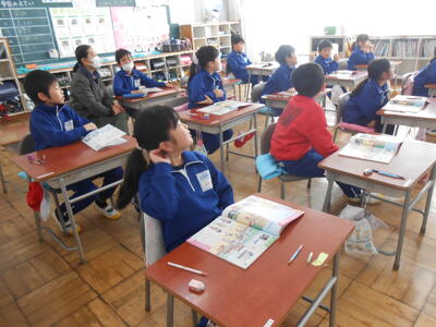 3年生は国語の授業で、自分で調べたい身近な道具について、説明文を書いていく学習でした。「筆入れ」「テープ」「磁石」などの道具があがっていました。4年生は音楽の授業で、日本の地域に伝わる伝統的な音楽を鑑賞していました。「こきりこ」について、初めて聴く楽器の音でしたが、どのように聴こえたか言葉で表現していました。
