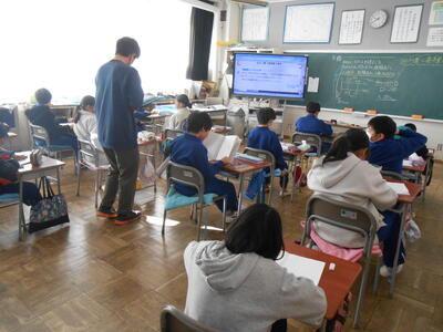 5年生も6年生も算数の授業でした。5年生は、割合の学習で、基準量より比較量が大きくなる場合の求め方を考えていました。6年生は、比についての学習で、友達と話し合いながら課題解決に向けて考えていました。