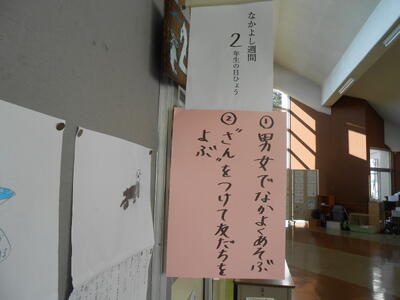 人権週間が始まりました。先日は人権の図書のコーナーについて紹介しましたが、人権ツリーも広場に登場しました。良いことをした行いなどを紹介するコーナーです。きっとたくさん飾られると思います。また、各教室の入り口には、子供たちが考えた人権の目標が貼られています。