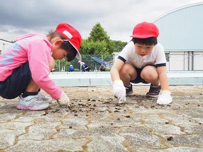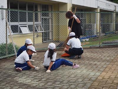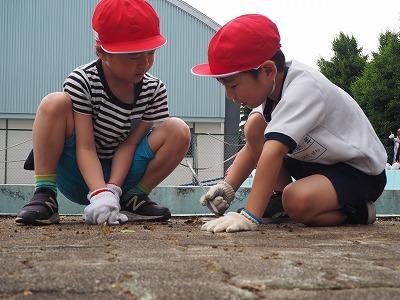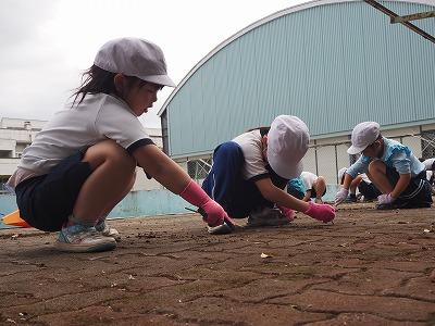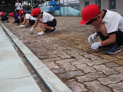 1年生から3年生までのプール清掃です。プールサイドのブロックの目地に溜まった土を取り除く作業をしました。ご協力いただいた保護者の皆様、ありがとうございました。
