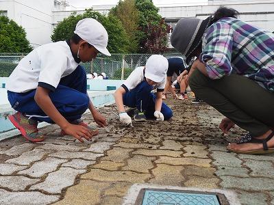 今月から9月末まで、毎週木曜日の掃除の時間に全校除草を行います。今日がその第1日目です。みんながんばって草むしりをしてくれ、花壇がとてもきれいになりました。