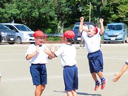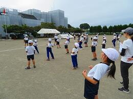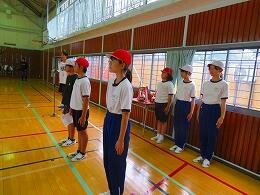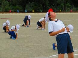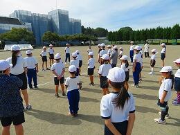 今日の業間は、初めての応援合戦の練習を、全員で校庭に出て行いました。