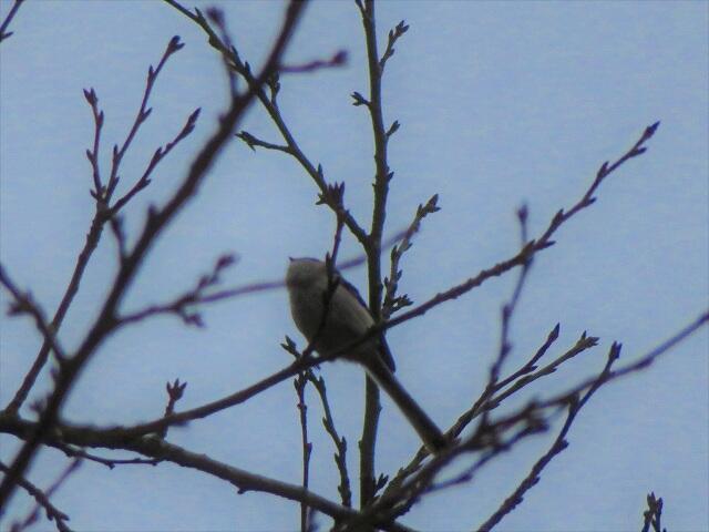 今朝は、いつものようにあいさつをしていると、鳥のさえずりがよく聞こえました。カメラを向けてみると、自信はありませんが、たぶんエナガだと思います。一生懸命、桜の枝をついばんでいました。