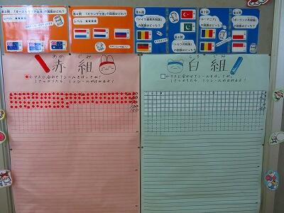 図書室では、紅白対抗、図書の貸し出し冊数対決をしています。