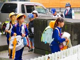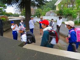 まぶしいくらいの朝日の中、子供たちが登校してきました。
