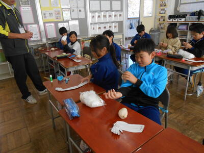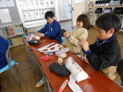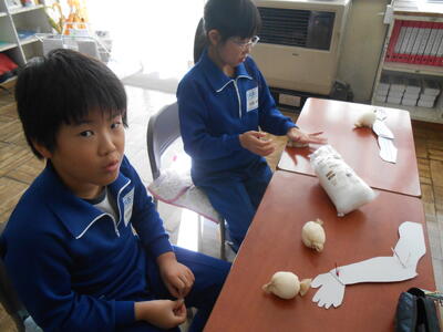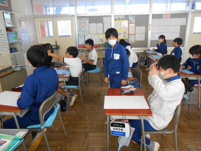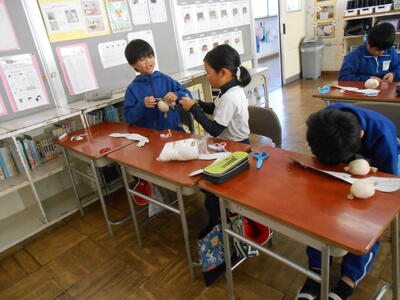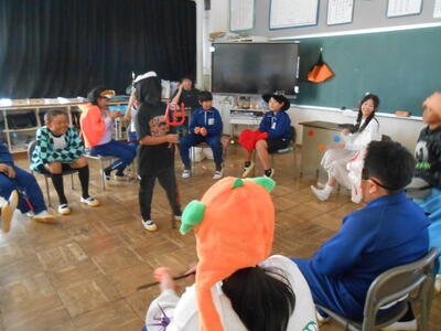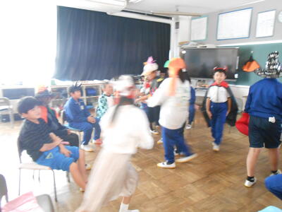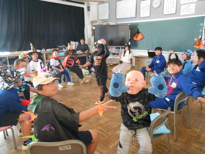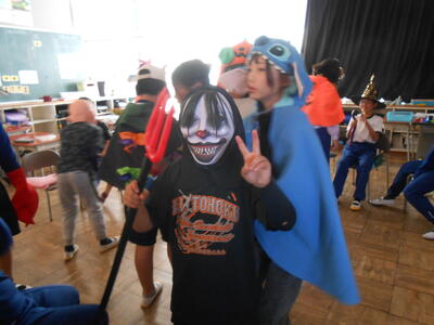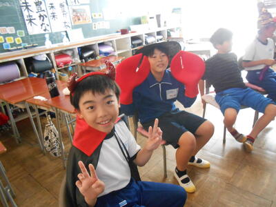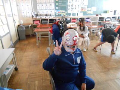 4年生は、理科の授業でした。体の仕組みで筋肉がどこについているのか模型を作って考えていました。5年生は、学活で、ハロウィンレクリエーションをやっていました。思い思いに仮装した姿で楽しんでいました。6年生は、図工で、版画の学習でした。動きのある人物を大きく描き、彫る活動に入ってる子もいました。