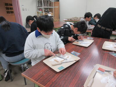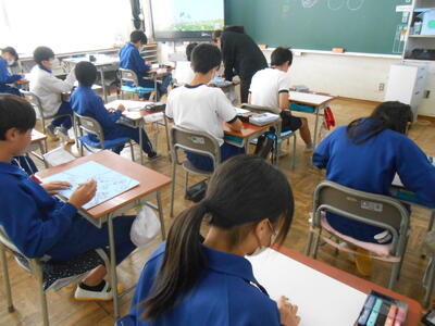 家庭科の授業でした。ごはんとみそ汁の調理実習に向けて、ごはんやみそ汁の栄養や日ごろの生活について振り返り確認しながら、ノートにまとめていました。