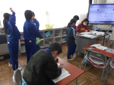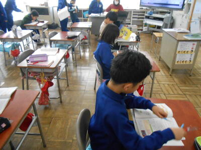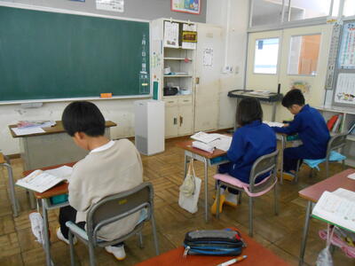3年生は、国語で俳句の学習でした。季語について理解し、五、七、七の文字数でできるように、言葉を選んで作っていました。4年生は、算数のまとめを行っていました。教科書の復習問題にチャレンジしていました。