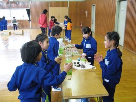 1年生が生活科の授業で、落ち葉や木の実をたくさん拾ってきました。その発展学習として落ち葉や木の実を使ったお店を開き、2年生を招待しました。「どんぐりごま屋さん」「しんけいすいじゃく屋さん」「パラシュート屋さん」「迷路屋さん」「どんぐり落とし屋さん」「的当て屋さん」「まつぼっくり釣り屋さん」「けんだま・ヨーヨー屋さん」たくさん工夫した遊びを考えたお店屋さんがあり、楽しい時間となりました。