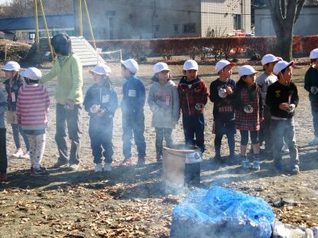 2年生が、さいこう農園で収穫したサツマイモを校庭の落ち葉で「焼きいも会」を行いました。焼き上がったいもは、1年生にもご馳走してあげました。