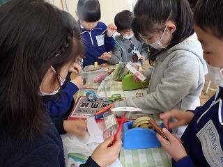 生活科「紙トンボ」づくりの1年生。来週はにしだ幼稚園のみなさんが来校。