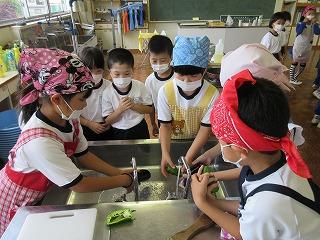 学校農園で収穫した野菜。1,2年生は調理して味わいました。