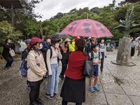 また少し小雨が降り始めました。鎌倉の大仏の前で、集合写真を撮り、ガイドさんの説明を聞いたら、班別行動になります。