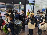 蓮田でトイレ休憩です。残念ながら、少し雨が降っています。子どもたちは、グループごとに考えてきたクイズで、楽しくバスの中で過ごしています。