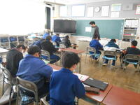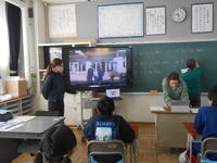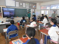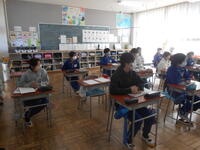5年生は、算数の授業でした。 円と正多角形を組み合わせた発展問題に取り組んでいました。計算の仕方を工夫して答えを求め、友達と確かめ合っていました。6年生は、外国語の時間でした。大内中や真岡中の先輩が作った英語でのメッセージ動画を視聴していました。