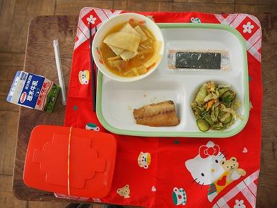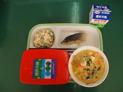 献立:ごはん、味付けのり、牛乳、さばのみぞれに、ゆずかつおあえ、ほうとう汁