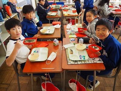 献立:ごはん、のり香味、牛乳、白糸たらの西京焼き、千切り大根のサラダ、むらくも汁