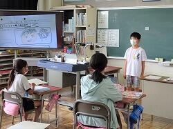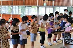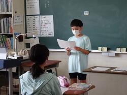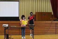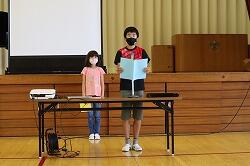児童代表あいさつでは、3年生は、1学期に楽しかったこととして、全校共遊やプール・タブレットを使った学習・学級でのレクリエーションなどをあげ、2学期は外国語の学習や運動会を頑張りたいと発表していました。6年生は、陸上で練習を頑張って県の記録会に出た思い出を話し、夏休みも陸上や勉強を頑張りたいと堂々と発表しました。