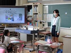 ほとんどの児童は、何も見ないですらすらと英語で発表していました。また、質問も英語で「What 〇〇 do you like ?」などと流ちょうに質問し、発表者も「I like 〇〇.」と答えていました。「とても上達しました。」とほめてもらっていました。発表が終わった後は、今学期の復習テストを行ったり、シルエットクイズのようなものを行っていたり、楽しい外国語の授業でした。