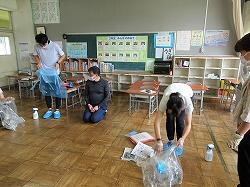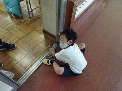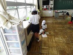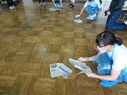 3・4年生は机を全部出して床をきれいにしていました。
