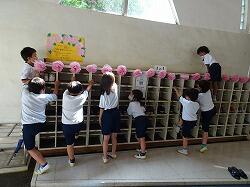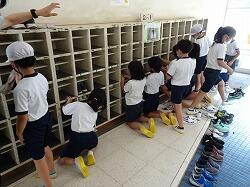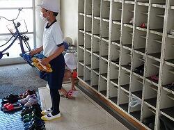 3枚目の写真は、靴箱そうじをしていた1年生の一人が、靴箱にのぼって上を拭き始めたら、みんなのぼろうとし始めたところです。先生にたしなめられていました。