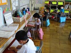 低学年のクラスと高学年のクラス(2つ)に分かれて夏休みの宿題などを行いました。「わからないことは手をあげて質問してね。」と担当の先生方が声をかけています。低学年の児童ももくもくと学習を進めていました。