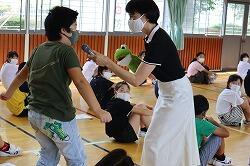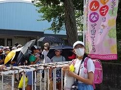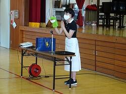 次に児童指導の先生から夏休みの注意がありました。「無事カエル」君が登場し、交通事故をはじめとし、いろんな危ないことに注意して、必ず無事帰って、夏休みを安全に過ごそうと呼びかけました。