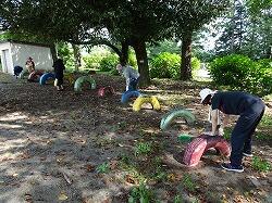 夏休みに入って「さいこうクラブ」の方たちに、ペンキ塗りを行っていただきました。26日は、北校庭のタイヤと鉄棒を行ってくださいました。