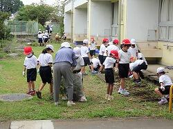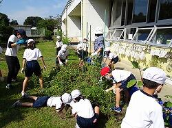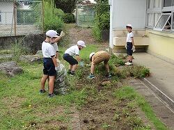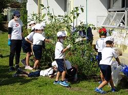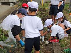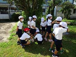 最後の写真は、カマキリを見つけて集まっていた様子です。余談ですが、片付けの途中で、担任が悲鳴をあげました。嫌いなカマキリが野菜の茎にいたのです。それを見た1年生は、そのあとカマキリを見つけるとつかまえて、担任に見せに来ます。ここで続けて驚くとますます喜んで持ってくるので、担任は、カマキリをもってきても平静を装い、「早く片付けしな」と冷静に対応するという高度な駆け引きが見られました。