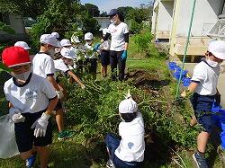 外で声がしたので行ってみると、1年生が農園の片づけを行っていました。