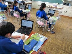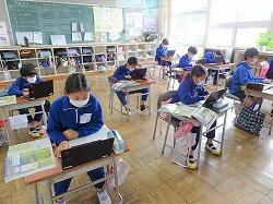 5年生と6年生のタブレットには、社会科のデジタル教科書が入っています。もともと教師用タブレットにはデジタル教科書が入っていて、電子黒板に写すことができますが、5・6年生は自分の端末でも教科書を見られます。