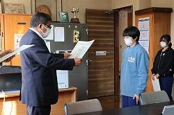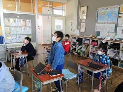 まずは各学年の代表者に修了証を渡しました。代表以外の児童は各クラスで一緒に礼をしています。代表の児童はしっかりした返事ができました。
