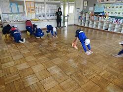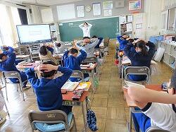 今日は昼休みにシェイクアウト訓練を行いました。2学期と3学期に1回ずつ行っています。「これは訓練です」という放送とともに緊急地震速報の音が流れました。今日は、大掃除・ワックスがけのため、昼休みは、教室の中のものを外に出すという作業をしていたので、児童はふいをつかれた感じです。